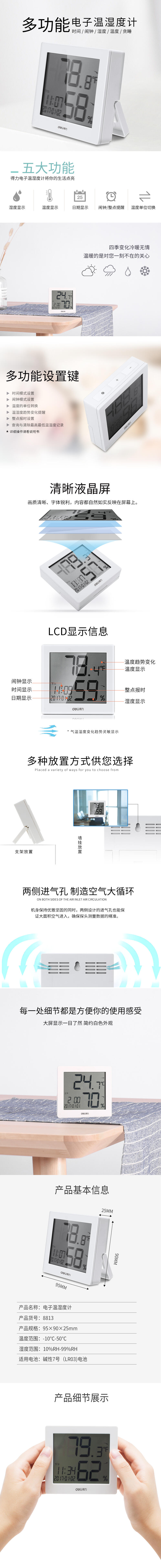 得力(deli)室內溫濕度表 LCD電子溫濕度計帶鬧鐘功能 嬰兒房室內溫濕度表 白色8813